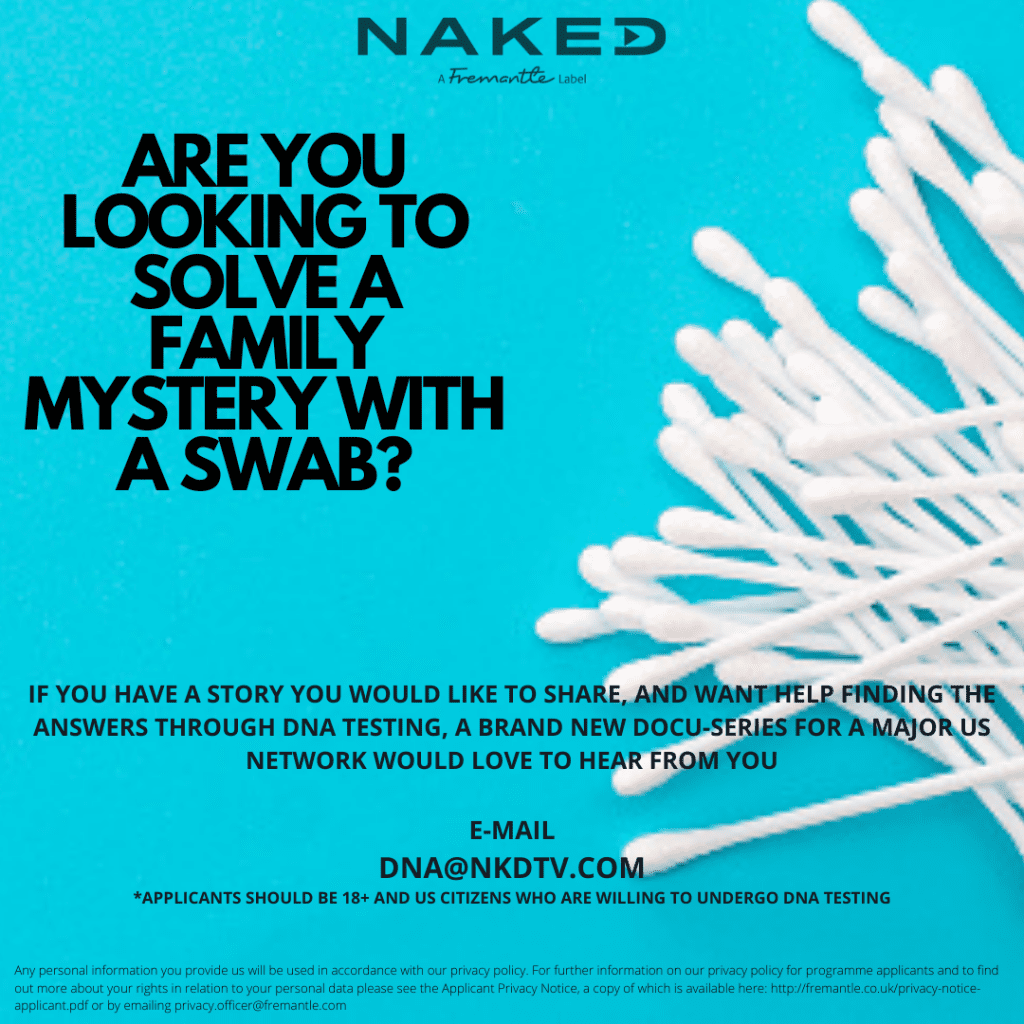 Have you always suspected your family may not be telling the whole truth? Naked, a Fremantle label, have teamed up with a Major US Network and we are looking for people who would be willing to undergo DNA testing in order to solve a lifelong mystery for a brand-new docuseries.