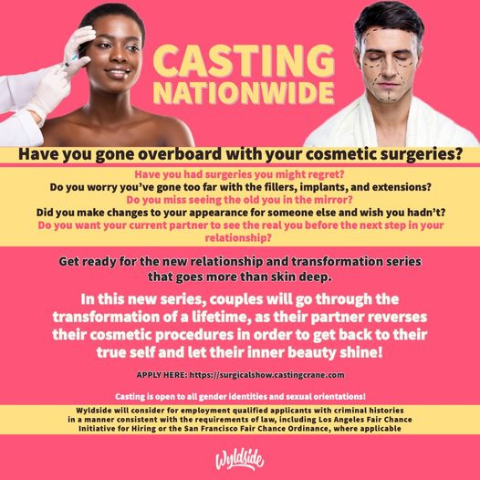 Have you had too much plastic surgery done and have a few regrets now? Have you had too much filler and feel like you walked away from your real self? If so, casting directors would love to hear your story for a TV show that is looking to cast people that miss their old looks and may be thinking about getting back to the REAL person in the mirror.
