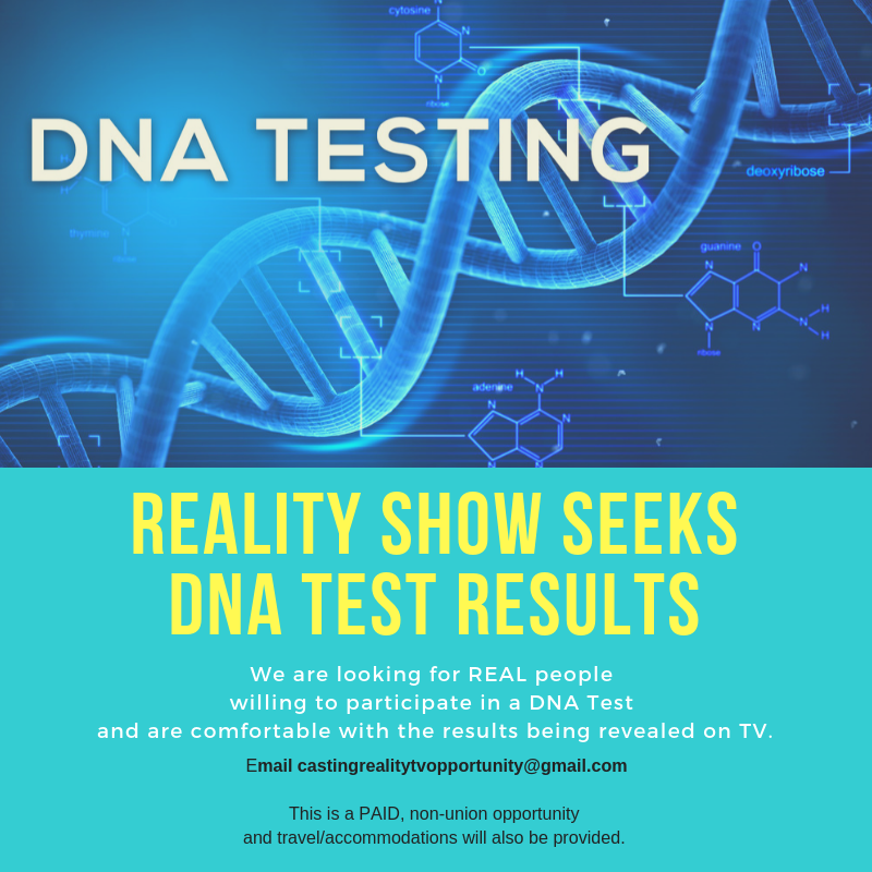 Reality show seeks talent who want DNA test results. We are looking for REAL people willing to participate in DNA testing and are comfortable with the results being revealed on TV. Testing can/may include paternity testing, sibling-DNA, etc. This is not testing to find ethnic make up; we are looking to confirm whether or not parties are related or to establish paternity.