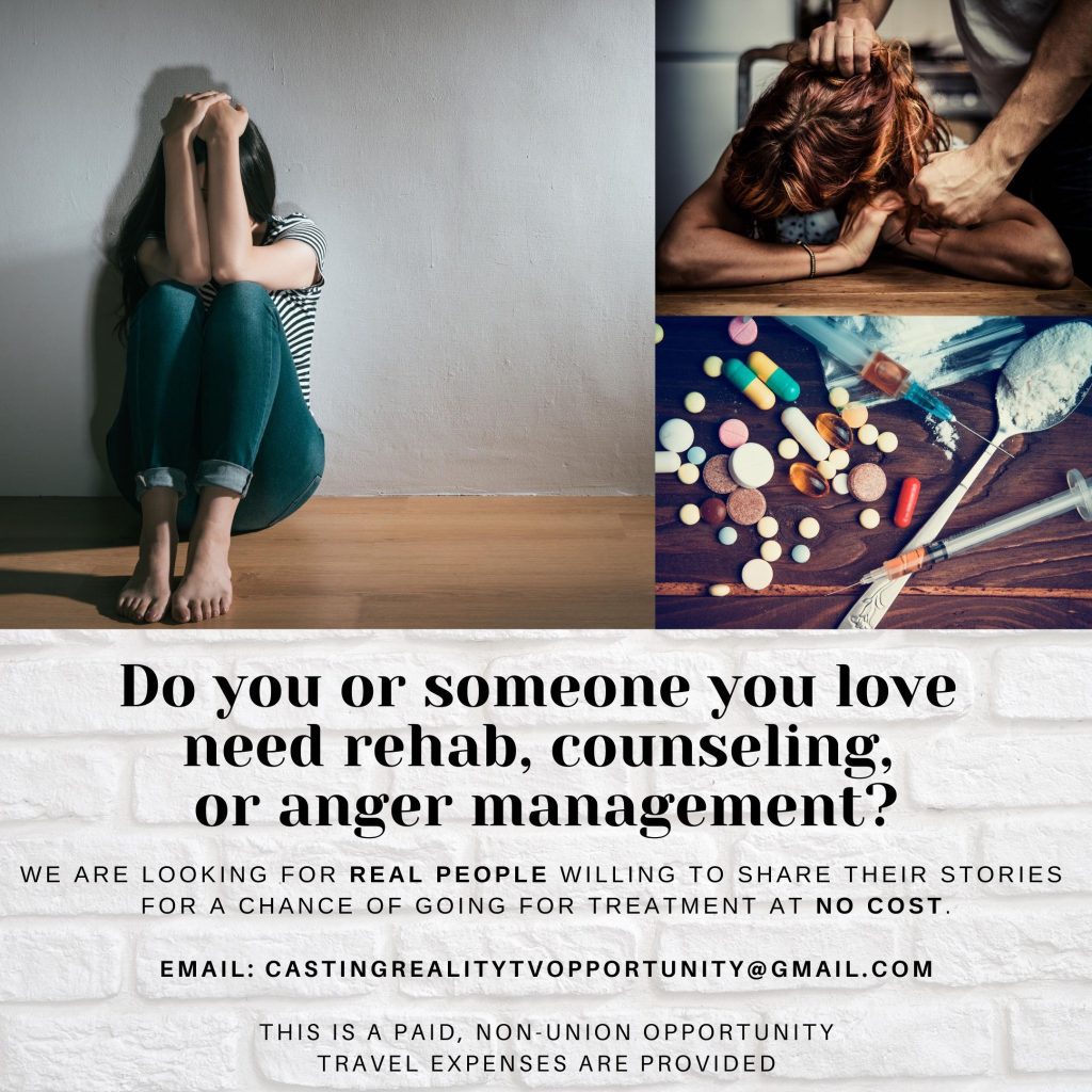 Do you or someone you love need rehab, counseling, or anger management? We are looking for REAL people willing to share their stories for a chance of going to treatment at NO COST!