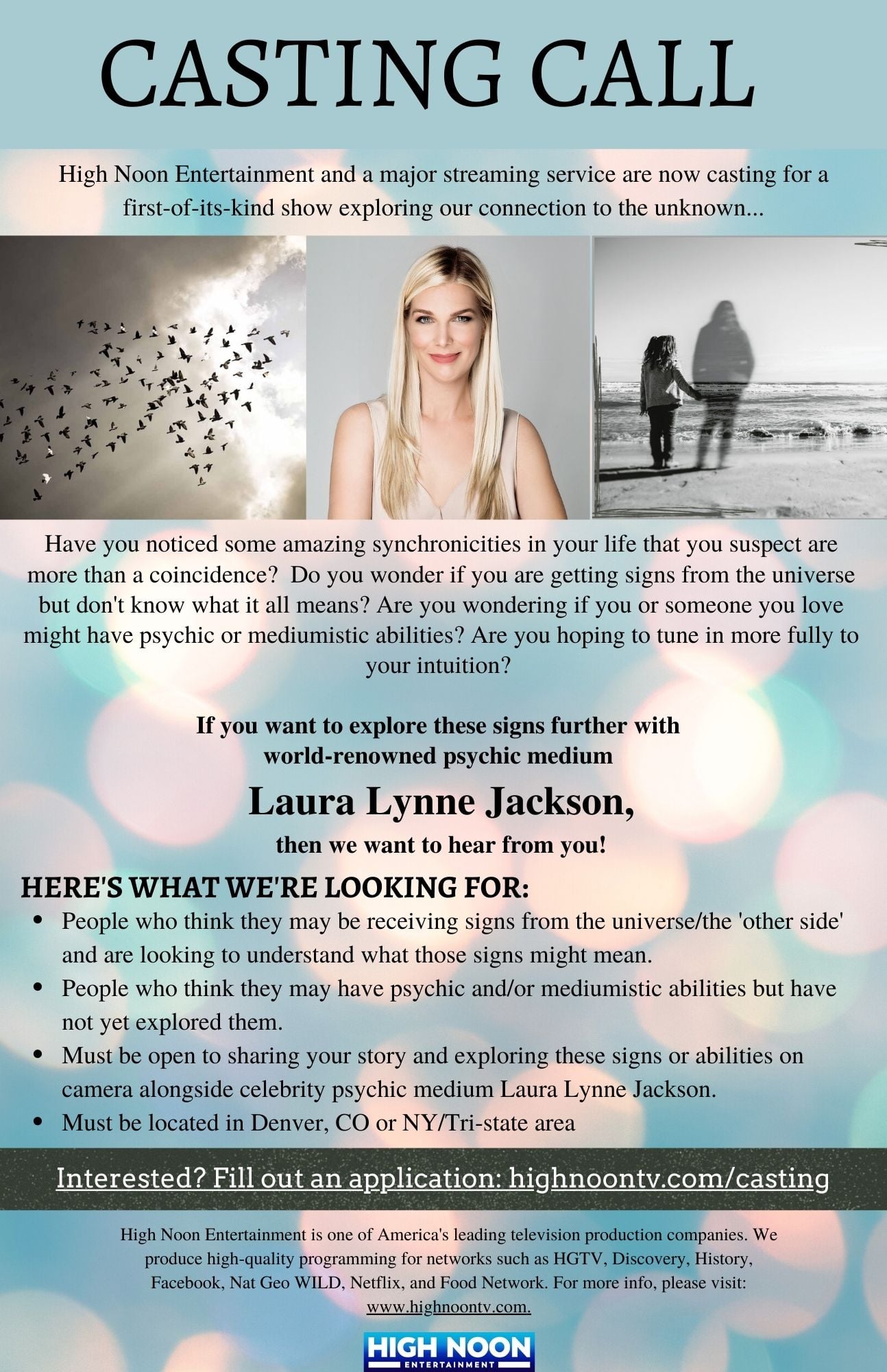 We are seeking folks in the NY Tri-State area and Denver, CO who are looking to dive deeper into their intuitive experience and psychic abilities with psychic/medium Laura Lynne Jackson, whose waitlist is over 10 years long and filled with celebrity clients like Jennifer Aniston and Gwyneth Paltrow.
