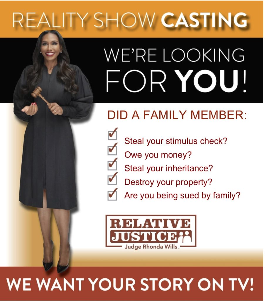 We’re looking for participants for a one-day appearance on a national court television show, Relative Justice with Judge Rhonda Wills. PAID APPEARANCE and opportunity to win more money. Travel costs are covered with no cost to you whatsoever.