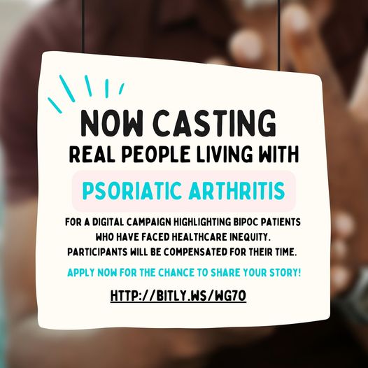 Sharecare, is an award-winning digital health company that helps people manage their health in one place. We are currently trying to find PSORIATIC ARTHRITIS patients to share their health inequity stories in a series of digital videos. Our goal is to bring attention to this incredibly important topic. Participation is paid, and the interview will be done over zoom. Apply today, more information! http://bitly.ws/wG7o