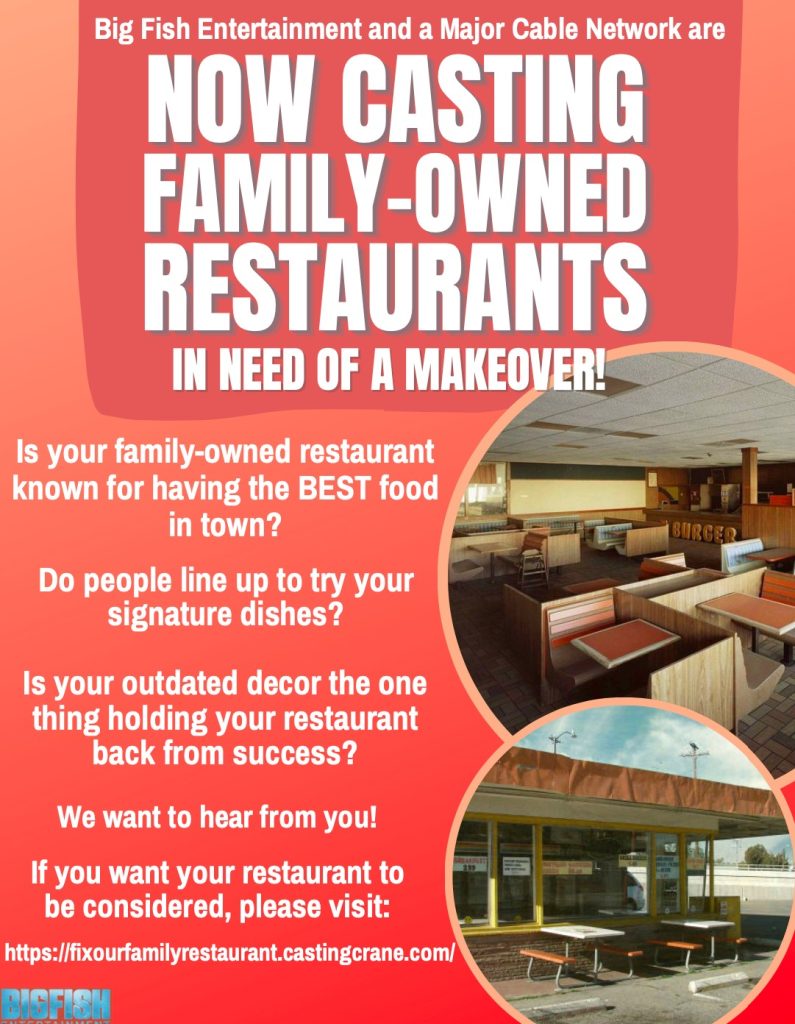 Big Fish Entertainment and a major cable network are now casting for great family owned restaurants that are in serious need of a great makeover.