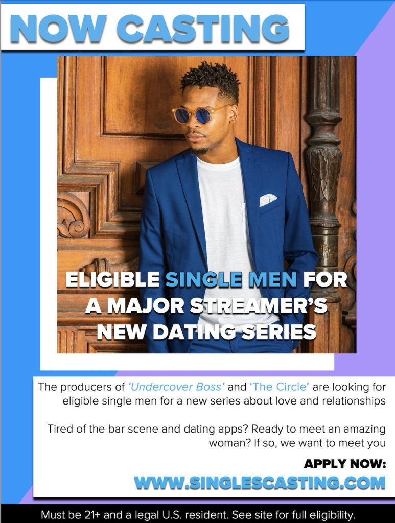Now casting ELIGIBLE SINGLE MEN for a major streamer’s new dating series.