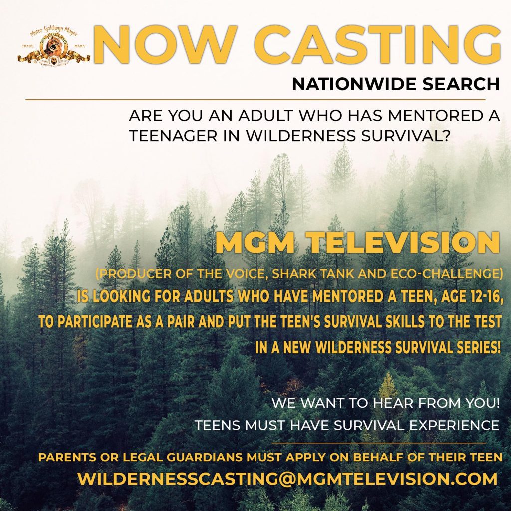 MGM Television (producer of Eco-Challenge, Shark Tank etc) is looking for adults who have mentored a teenager, age 12-16, to participate as a pair in a new wilderness survival series. Teens MUST have survival skills. Send us an email or pass along to anyone who may be interested!