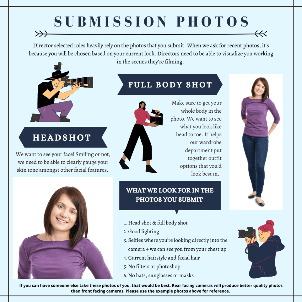 – PHOTOS: Please submit a headshot and a full length photo that reflects your current look/hairstyle.