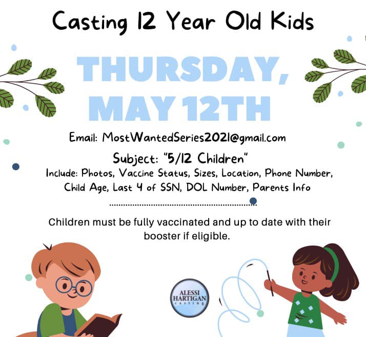 Submit your information to “MostWantedSeries2021@gmail.com” with “5/12 Children” in the subject line and include the following info: name, contact cell, height/weight/shirt, date of birth, DOL number, last 4 of social, parents contact info/name