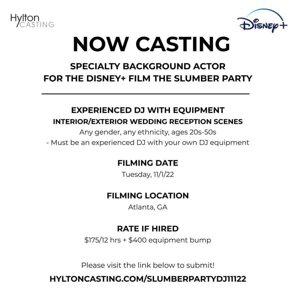 Hylton Casting is currently casting an experienced DJ to work as a background actor on the Disney+ Film The Slumber Party in wedding reception scenes filming on Tuesday, 11/1/22 in Atlanta, GA.