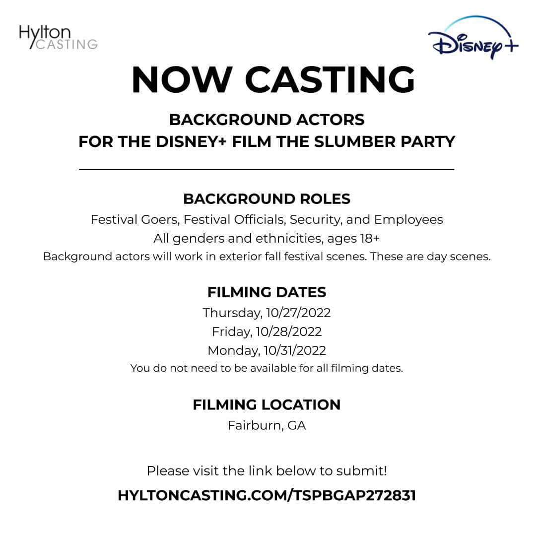 Hylton Casting is currently casting background actors for the Disney+ film The Slumber Party to work in scenes filming on Tuesday, 11/01/2022 Atlanta, GA. Please note, you must also be fully vaccinated to work on this production.