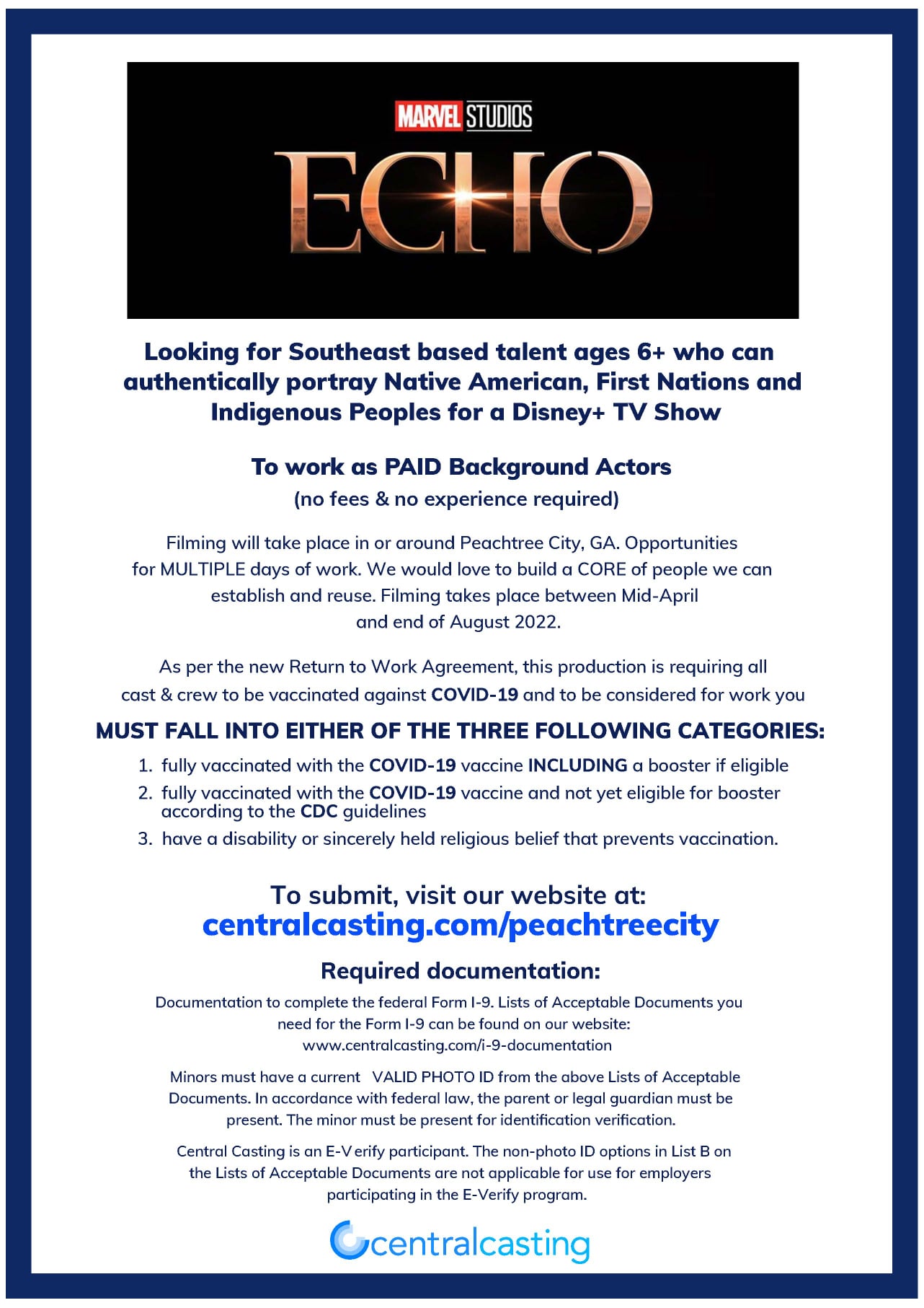Casting directors for a brand new Disney series are now casting in and around the Peachtree City, Georgia area and around the Southeastern part of the united states for talent that is ages 6+ who can play native American, First Nation and Indigenous peoples.