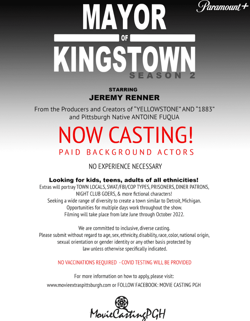 The new season of the Paramount+ TV series “The Mayor of Kingstown” is now in production in the Pittsburgh, Pennsylvania area and casting directors for the Paramount+ project have released an open casting call for Pittsburgh area residents who would like a shot at working on set as a paid background actor, photo double or stand in.