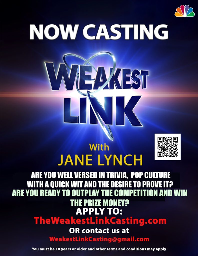 If so, here is a chance because the game show, “The Weakest Link” is now casting for contestants. The show is hosted by Jane Lynch and puts contestants to the challenge of finding the weakest link among them.