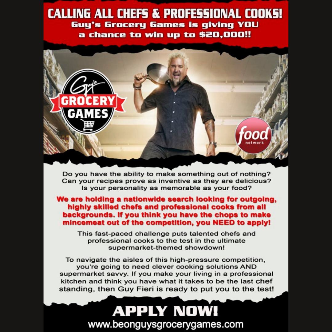 Casting call for a new season of the Guy Fiery show, Guys Grocery Games.