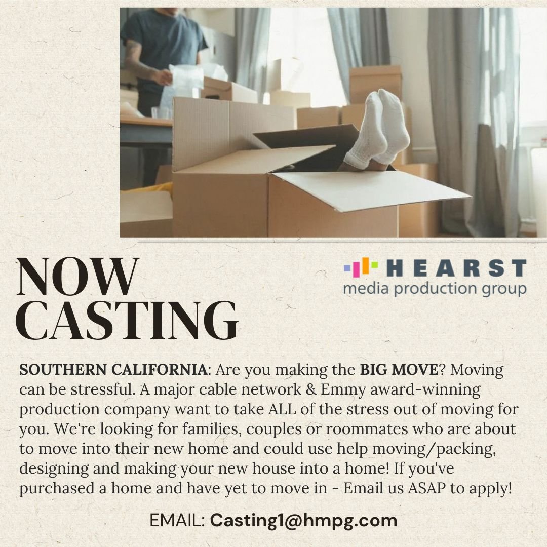 NOW CASTING in SOUTHERN CALIFORNIA: Hearst Media Production Group and a Major Cable Network are seeking people who are moving to or within the Southern California area!