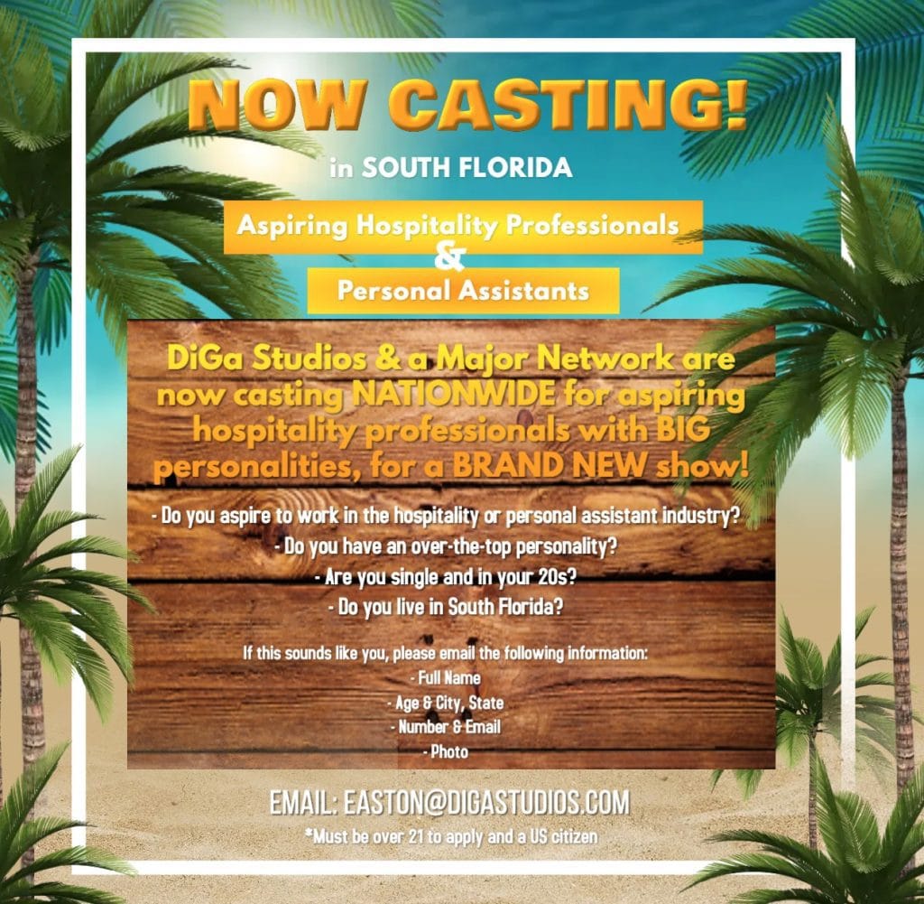 Currently searching South Florida for singles in their 20s, who are aspiring to work in the hospitality or personal assistant industries for a really fun new show!