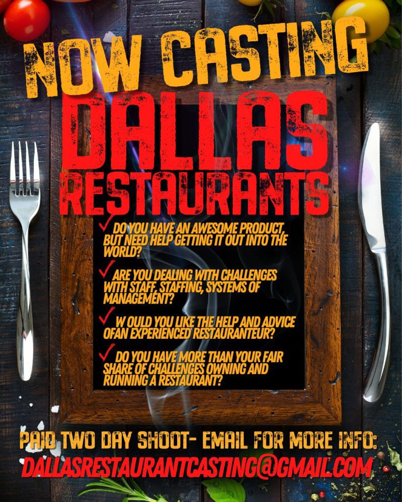 Brand-new television series for major lifestyle network (this is NOT an existing show on TV and is NOT a rescue show) is seeking Dallas area restaurants to feature in an exciting new television series. For more details and to be considered please email: dallasrestaurantcasting@gmail.com