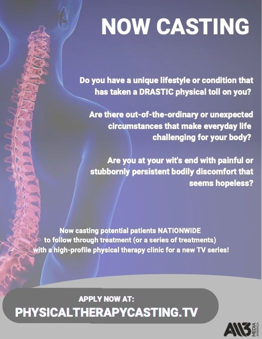 Now casting potential patients NATIONWIDE to follow through treatment (or a series of treatments) with a high-profile physical therapy clinic for a new TV series. Full app at: physicaltherapycasting.tv
