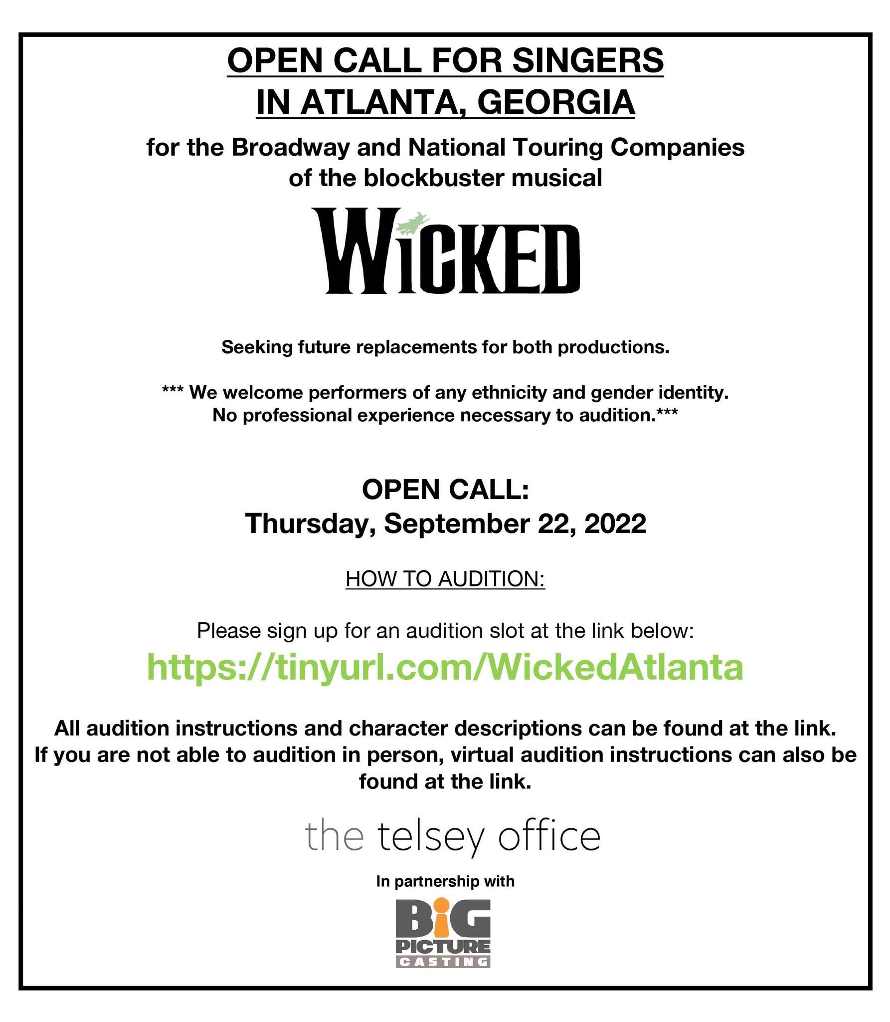 Singing auditions for the production of “Wicked” will be in Atlanta this month.