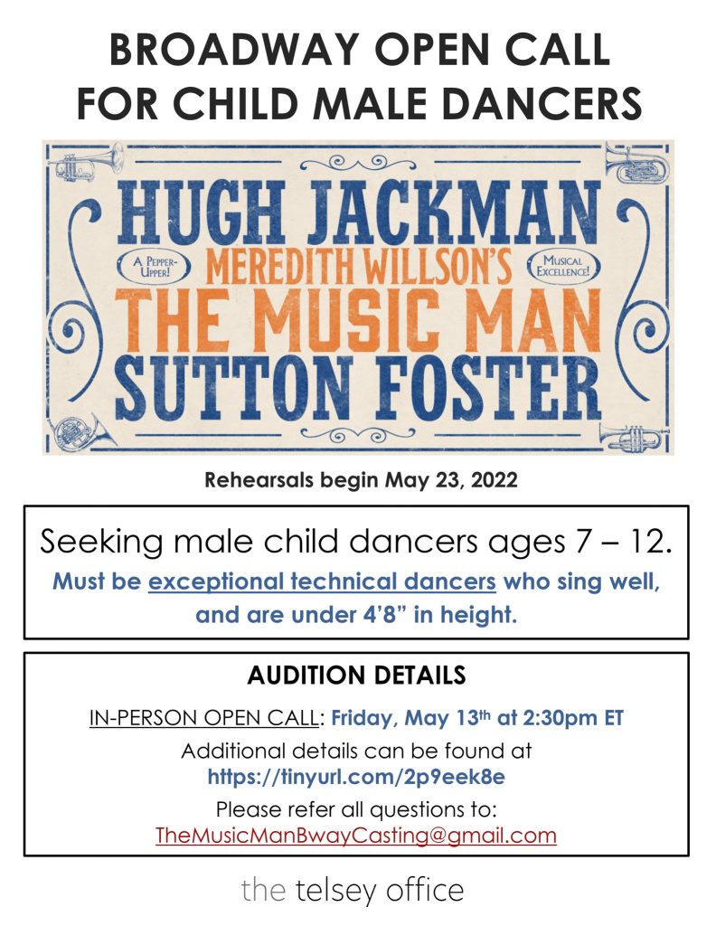 Open Call for male child dancers between the ages of 7 and 12 to join the Broadway production of “The Music Man” which stars Hugh Jackman.