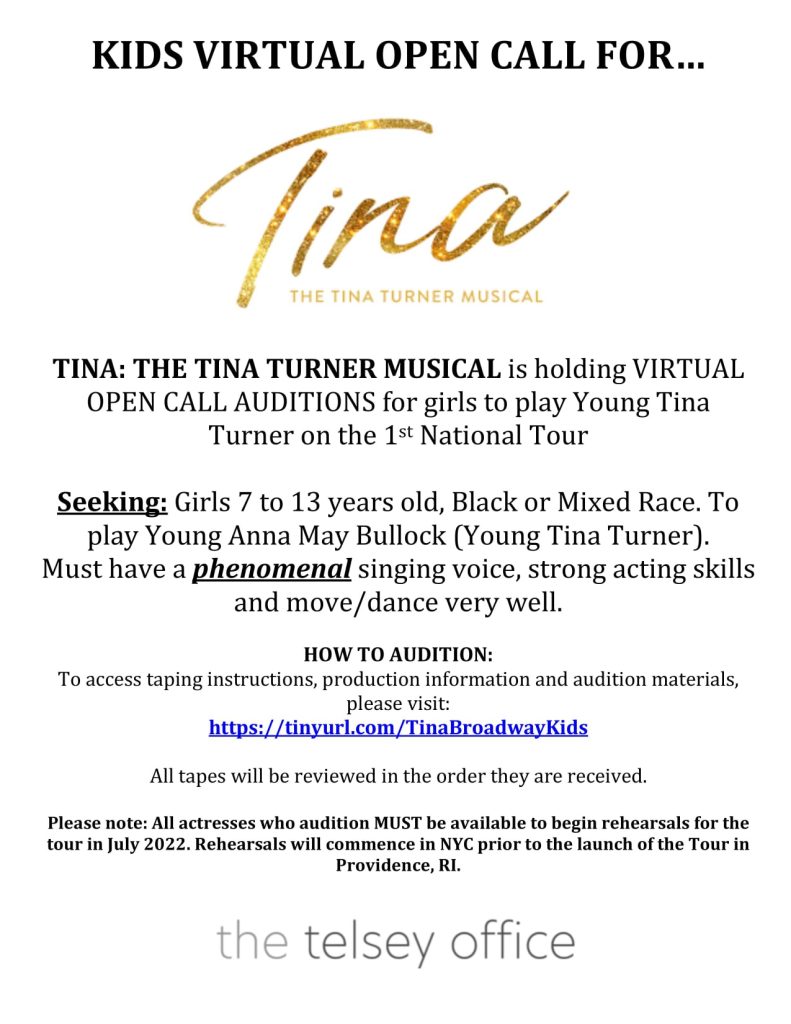 Video / online auditions are for girls 7 to 13 years of age who are African American or of mixed race. The role that the girls will be playing is that of a young Anna May Bullock (Tina Turner). Girls applying for the role must have a phenomenal singing voice, must have strong acting skills and must also move and dance well. This is for the live production of Tina on Broadway.
