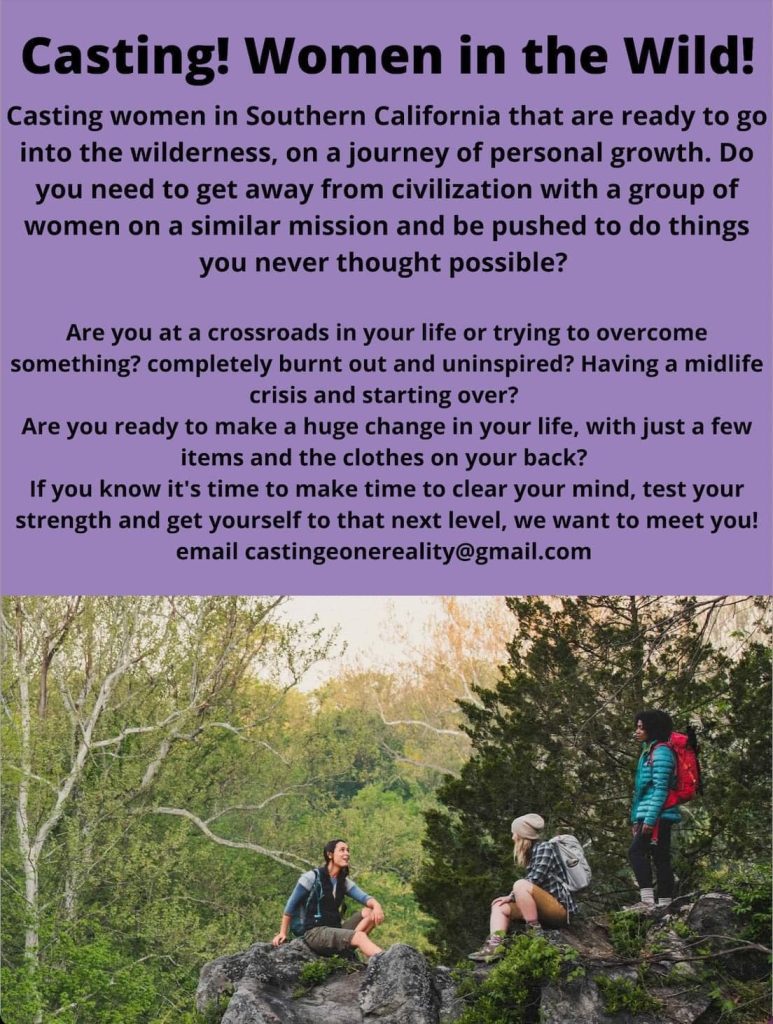 There is an audition notice for a reality show which is seeking adventure ready ladies that would love to get closer to nature. Are you a woman in the SoCal area that is ready to go into the wilderness? Are you ready for a journey of personal growth? Do you want….or need to get away from civilization for a bit and would you love to get away from civilization with a group of like minded women who have a similar mission and would not mind being pushed to do things that you personally have never thought was even possible before?