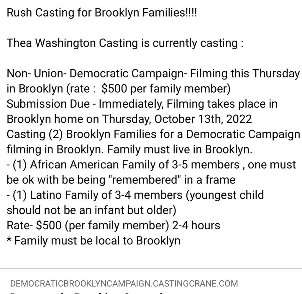 Casting (2) Brooklyn Families for a Democratic Campaign filming in Brooklyn. Family must live in Brooklyn.
