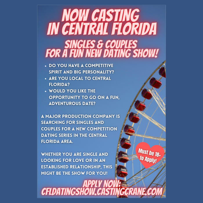 Casting call in central Florida for singles and couples for a fun new dating show.