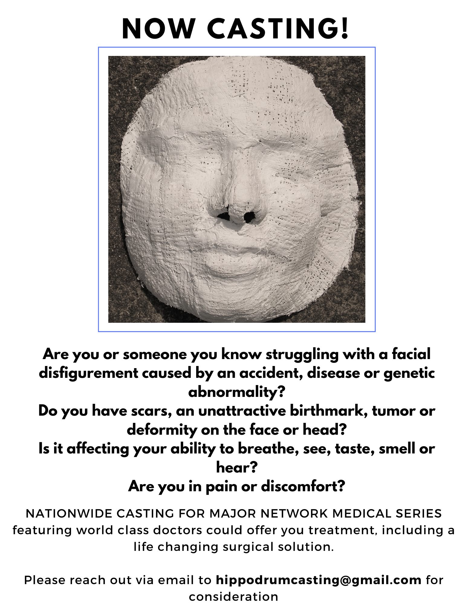 Do you have scars, an unattractive birthmark, tumor, or deformity on the face or head? Is it affecting your ability to breathe, see, taste, smell, or hear? Are you in pain or discomfort? A medical TV series featuring world-class doctors could offer you treatment, including a life-changing surgical solution.