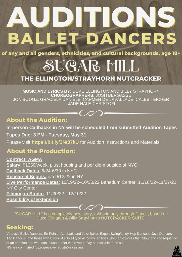We at Mungioli Theatricals are currently casting “SUGAR HILL: The Ellington/Strayhorn Nutcracker,” a completely new story, told primarily through Dance, based on Duke Ellington & Billy Strayhorn’s NUTCRACKER SUITE.