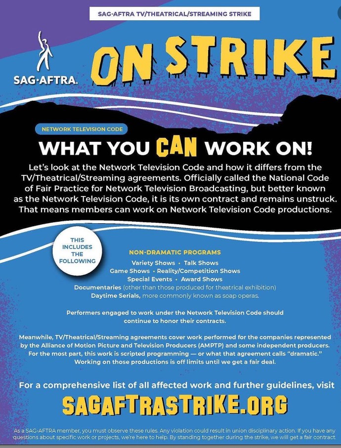 The current strike has put the breaks on quite a few productions. For those that are confused about the situation and what it means for current union members, I have attached the SAG-Aftra created break down of what union members can and cannot work on below. The info-graphics are their current released guidelines.