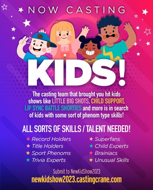 If the above sounds like your child, casting directors would love to hear all about your child and their talents. This is the final week of casting kids for a new show.