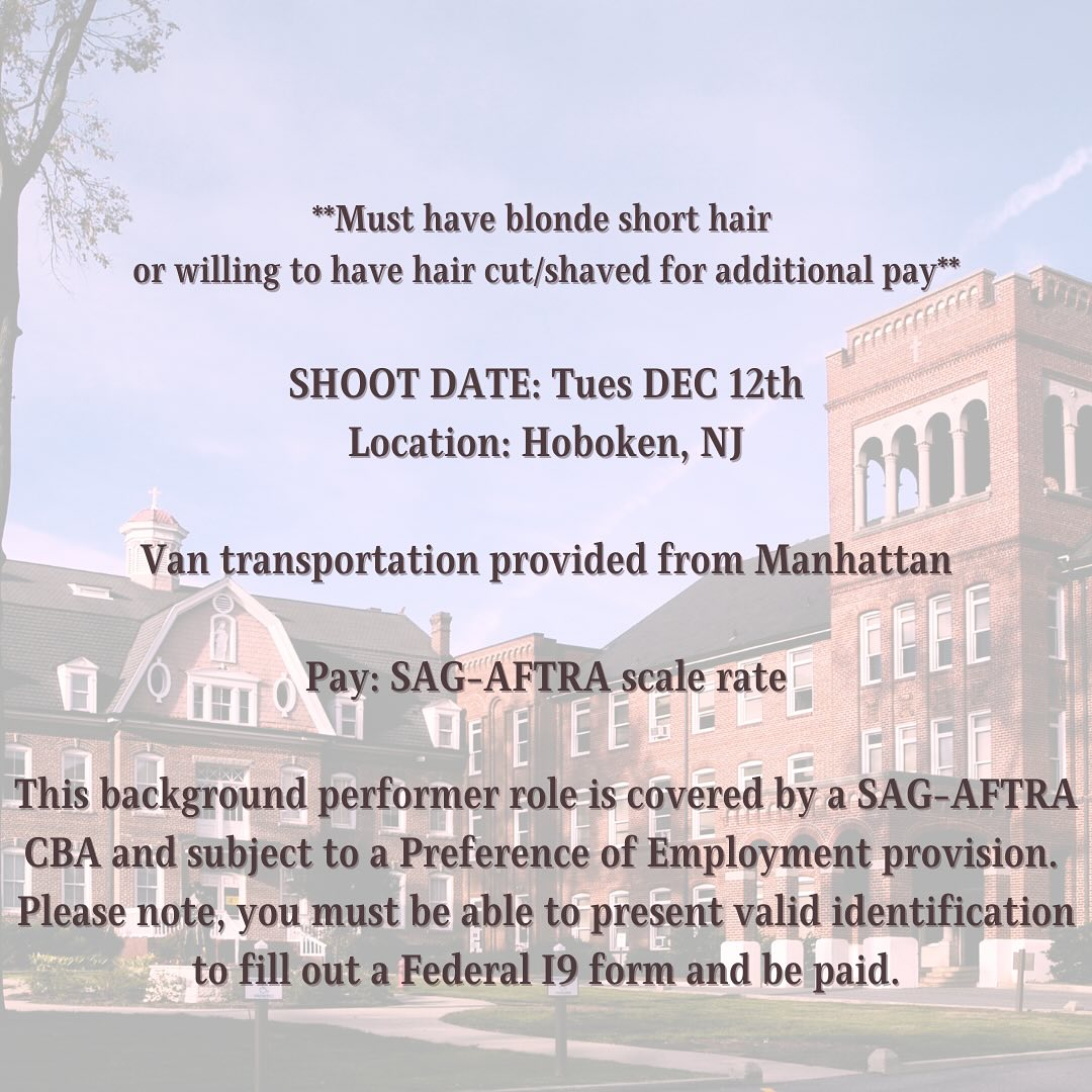 This background performer role is covered by a SAG-AFTRA CBA and subject to a Preference of Employment provision. Please note, you must be able to present valid identification to fill out a Federal 19 form and be paid.