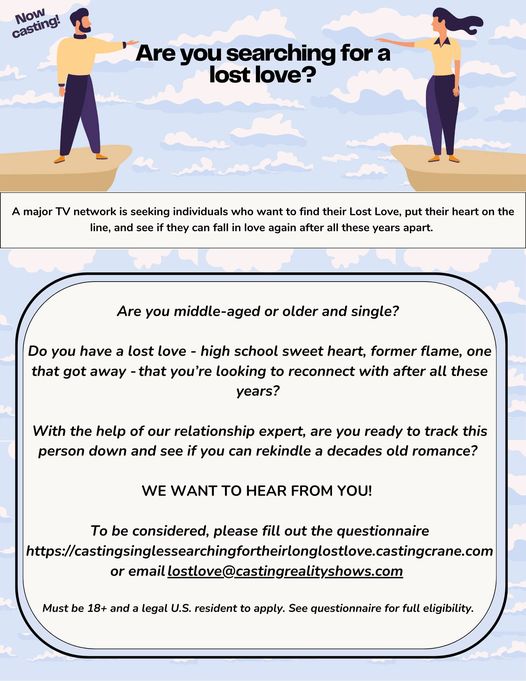 To be considered, please fill out the questionnaire https://castingsinglessearchingfortheirlonglostlove.castingcrane.com or email lostlove@castingrealityshows.com