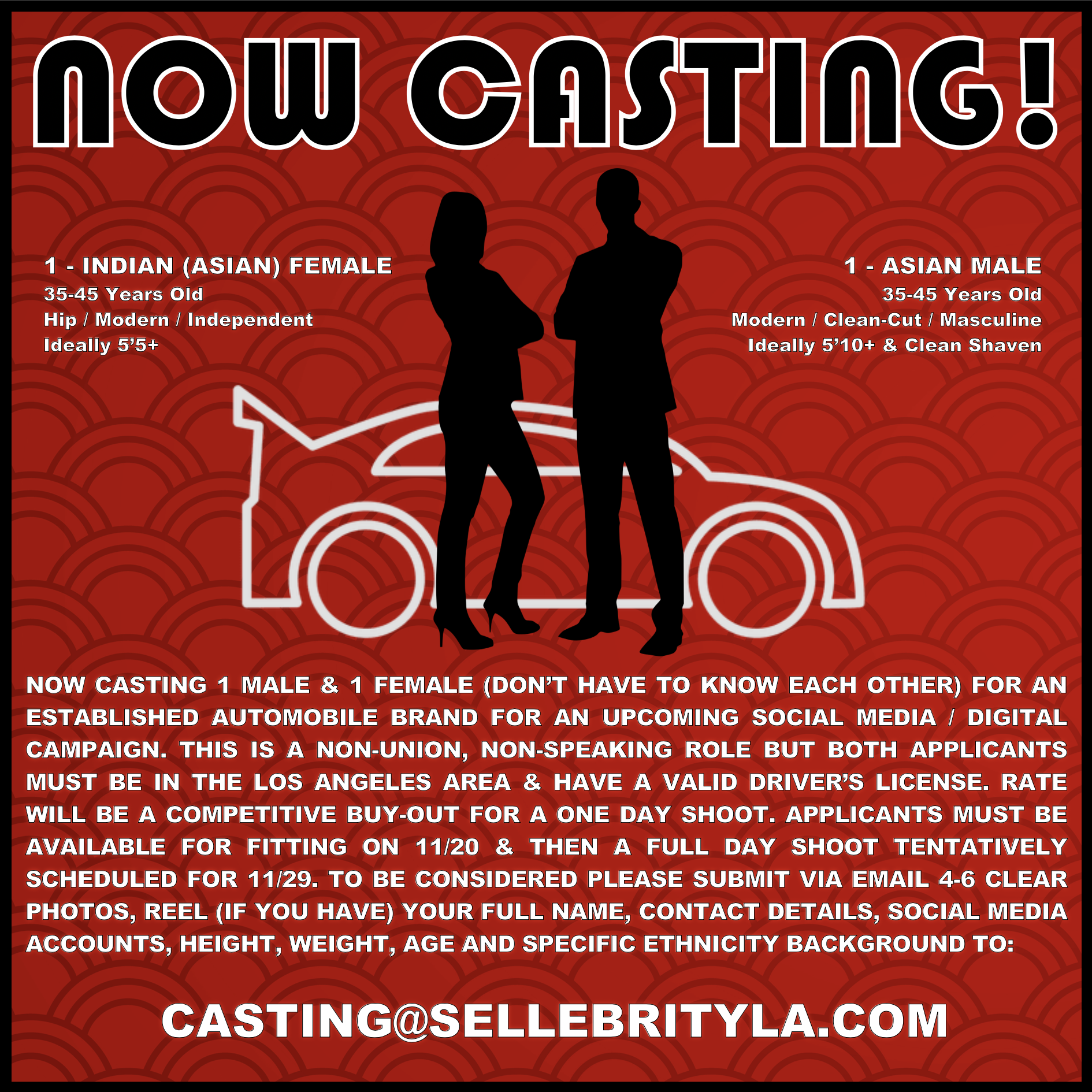 NOW CASTING 1 MALE & 1 FEMALE (DON’T HAVE TO KNOW EACH OTHER) FOR AN ESTABLISHED AUTOMOBILE BRAND FOR AN UPCOMING SOCIAL MEDIA / DIGITAL CAMPAIGN. THIS IS A NON-UNION, NON-SPEAKING ROLE BUT BOTH APPLICANTS MUST BE IN THE LOS ANGELES AREA & HAVE A VALID DRIVER’S LICENSE.