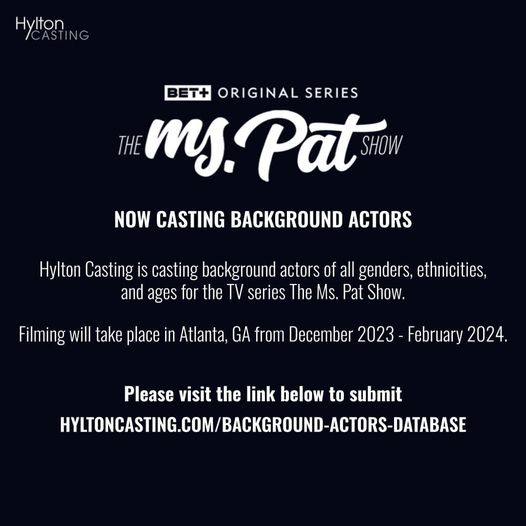 Ms. Pat will be in production from December 2023 to February 2024 in the Atlanta area and is now taking submissions for paid work as TV extras / background actors who live in the area that the show will be filming in, Atlanta, Georgia.