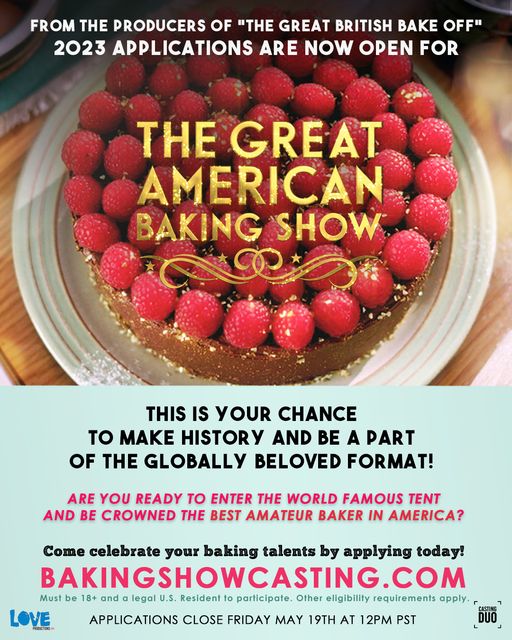 Now casting the newest season of The Great American Baking Show, brought to you by the same producing team behind the beloved Great British Bake Off! We’re looking for insanely talented AMATEUR bakers nationwide, so if you or someone you know fits the bill, have them apply today at BakingShowCasting.com