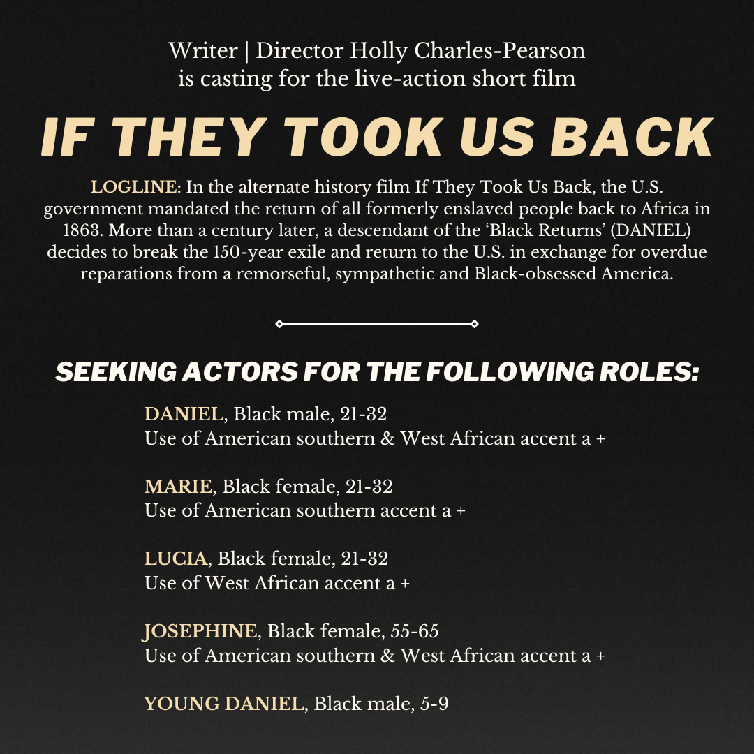 In the alternate history film If They Took Us Back, the U. S. government mandated the return of all formerly enslaved people back to Africa in 1863. More than a century later, a descendant of the ‘Black Returns’ (DANIEL) decides to break the 150-uear exile and return to the U.S. in exchange for overdue reparations from a remorseful, sympathetic and Black-obsessed America.