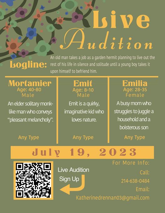 Producing a short film and we are having an audition for it from 9 am – 4 pm July 19 at KD Conservatory!