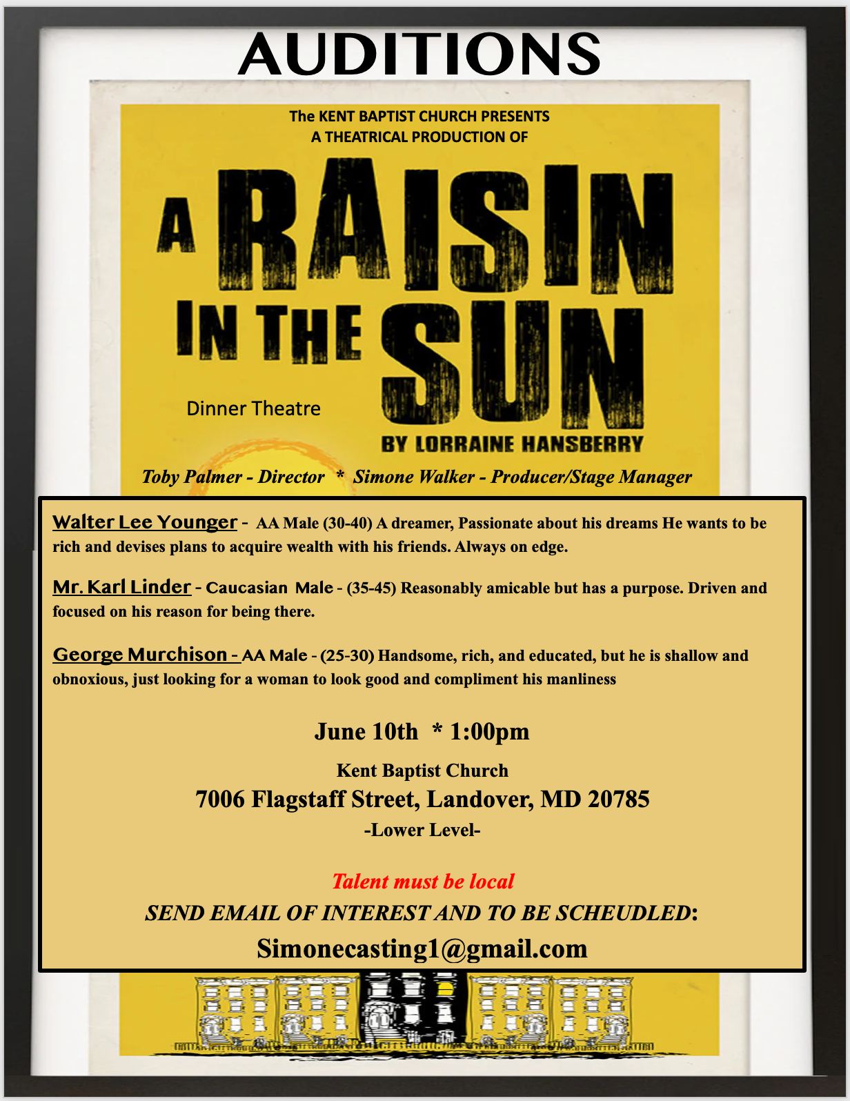 Auditions for “A Raisin in the Sun” in Landover, Maryland which is in the Washington, DC area.