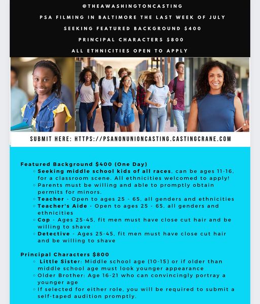 Project Description: We’re casting for a powerful Non-Union PSA on gun violence, filming in the DMV last week of July. Talent must be fully available during that week.