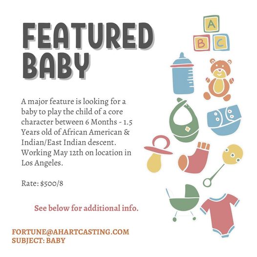 Major feature is looking for a baby to play the child of a core character between 6 Months – 1.5 Years old of African American & Indian/East Indian descent. Working May 12th on location in Los Angeles.