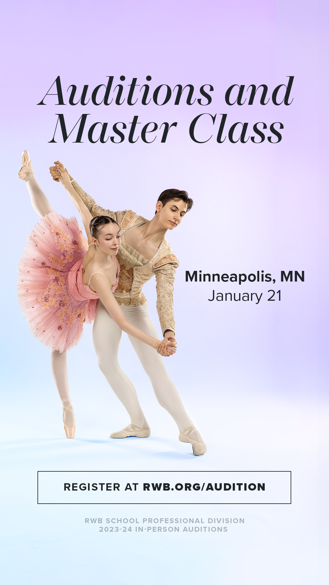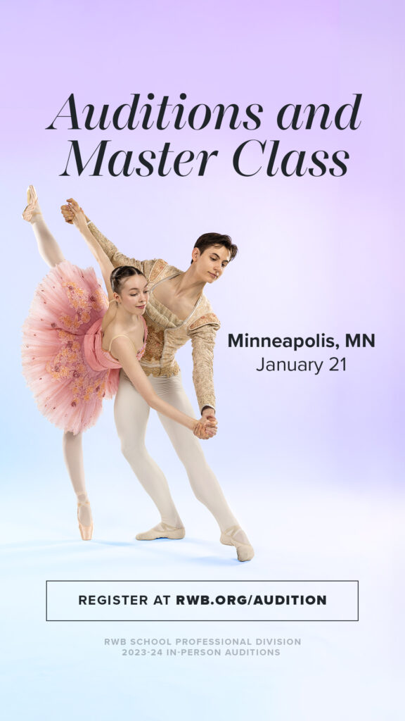 Students who wish to pursue a career in dance or dance education but are unable to attend an in-person or virtual audition may submit a video application. The RWB School accepts video auditions through the world’s largest arts audition class network platform, Acceptd. Acceptd will be available for auditions as of Sept 11, 2023. To review requirements and submit video audition materials, please visit: getacceptd.com. Video applications will be accepted until JUNE 1, 2024.