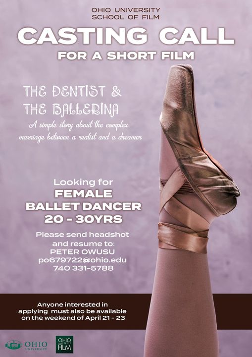 Student film at Ohio University, the Ohio University School of Film, is seeking a ballet dancer, locally, for the project.