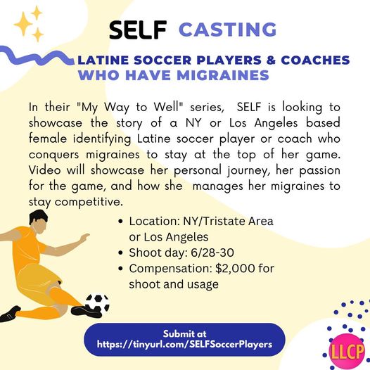 SELF is casting for NY and LA area Latin female-identifying Soccer player or Coach who conquers migraines to stay on top of their game!