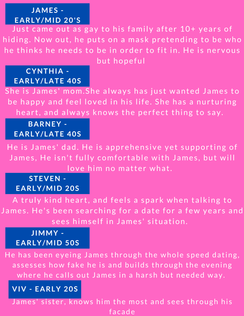 At the heart, this is a story about loving yourself, figuring yourself out, and loving who you are. James hides his real self behind a mask and acts how he thinks he needs to fit in and find a match during a speed date event at a local bar. In both a serious and comedic manner James confronts members of the LGBTQ community who see through his mask. In the end, can James truly take the mask away and accept who he is and find love in himself?