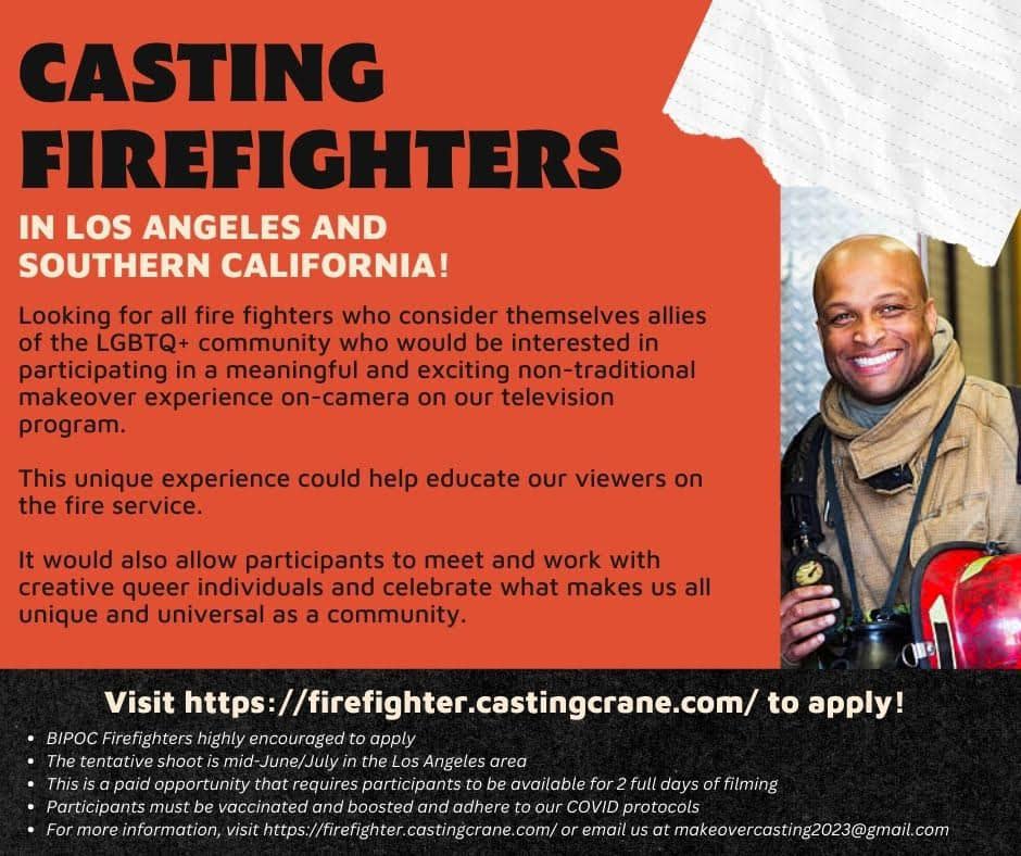 Looking for all fire fighters who consider themselves allies of the LGBTQ+ community who would be interested in participating in a meaningful and exciting, non-traditional, make over experience on camera on a television show.