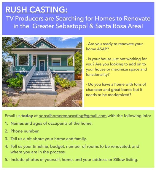 Casting call in Santa Rosa and Sebastopol areas for home owners wanting to renovate their homes.