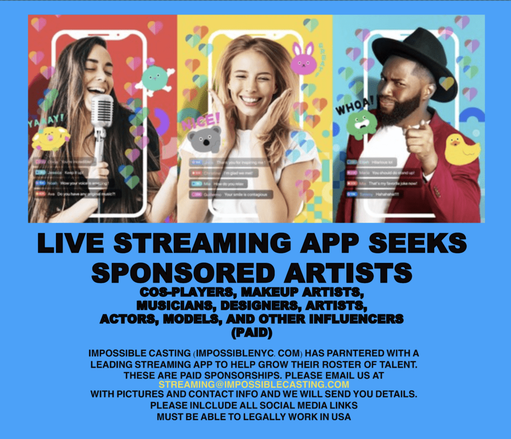 (PAID)Japan’s number one LiveStreaming app has partnered with Impossible Casting (ImpossibleNYC.com) to build their roster of managed and sponsored talent. Get paid to stream AND join the growing family. Submit pictures and social media links to streaming@impossiblecasting.com