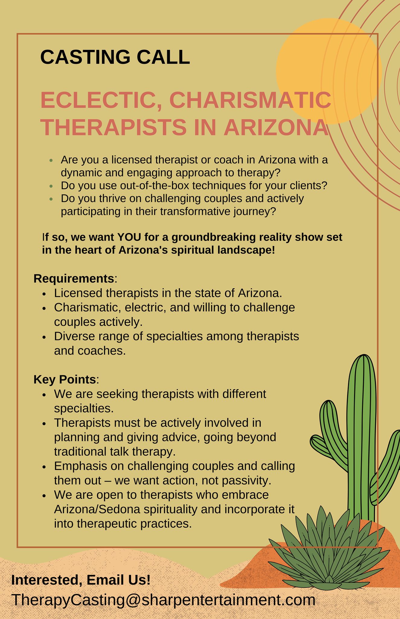 This is not your typical counseling setup – we’re seeking individuals who bring action and innovation to the therapeutic process. Candidates should embody the spiritual essence of Arizona/Sedona, offering a unique and spiritual perspective in their work.